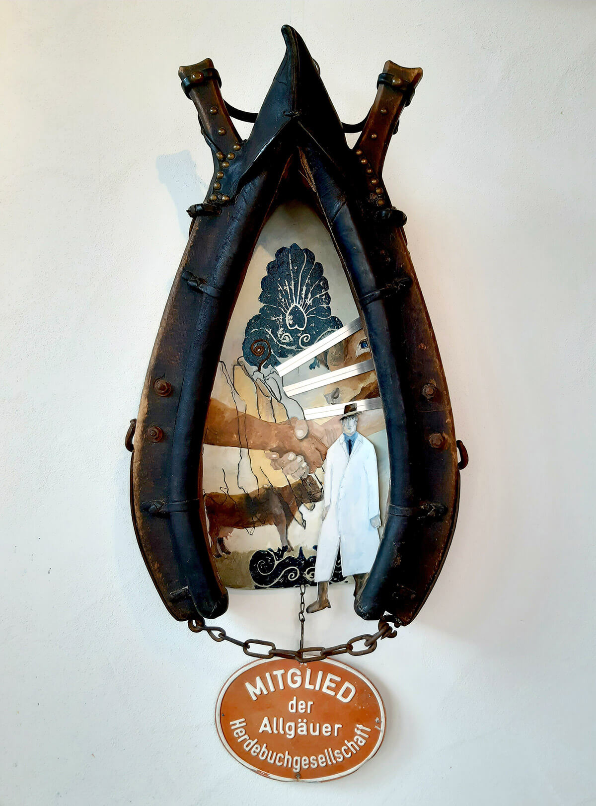 Das Kuhkummet in meiner Arbeit soll diese frühere Zeit symbolisieren. Damals war der Verkehr nicht so stark, es gibt fast nur Pferde und Ochsenfuhrwerke und die Kühe wurden auch als Arbeitstiere eingesetzt. Viehhändler gab es bis 1936/37, dann wurde ihnen der Handel untersagt und die Geschäfte übernahmen nichtjüdische Händler. Die anschließende Tragödie, die das jüdische Volk erleiden musste ist in meiner Arbeit durch das Ornament sichtbar gemacht worden. Dieses Ornament habe ich auf einem jüdischen Grabstein in Esslingen entdeckt.