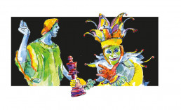 Zum Bild: „Die Musik inspirierte mich zum „Hofnarr“. Er hatte eine außergewöhnliche Position an den Adelshöfen, denn er unterhielt und verzauberte die Menschen und konnte gleichzeitig dem König oder Kaiser die Wahrheit sagen, ohne dafür bestraft zu werden. Er hält dem Betrachter die Schachfigur des Königs hin, er hat ihn sinnbildlich „in der Hand“ und der Betrachter könnte danach greifen. Die Figur, des Peter Gais, Mitglied der Bewegung: Armer Konrad, die in Bronze gegossen auf dem Beutelsbacher Marktplatz steht, sieht ihn an. Peter Gais, wurde geköpft für seinen Kampf gegen die Unterdrückung durch Herzog Ulrich von Württemberg und der einflussreichen Ehrbarkeit im Vorbauernaufstand des Remstals 1514.“